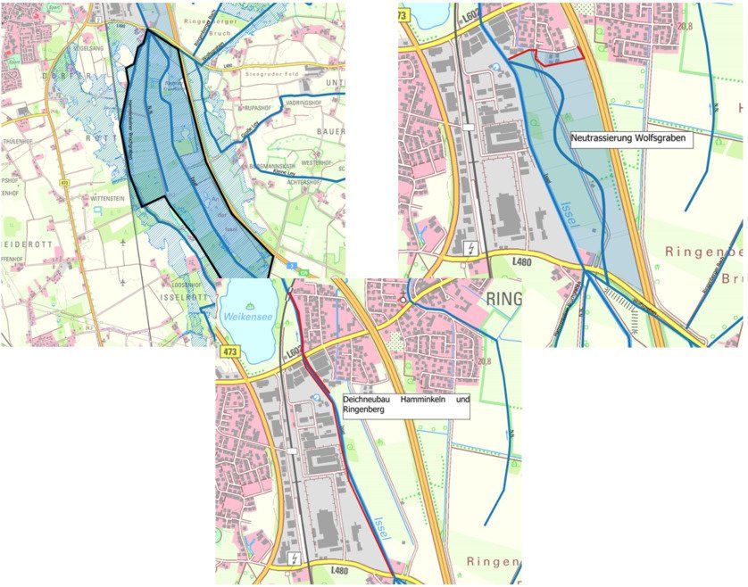Durch eine geplante Überlaufschwelle soll das festgesetzte Überschwemmungsgebiet mit einem zusätzlichen Volumen von 88.000 m³ beaufschlagt werden. Hierdurch muss weitergehend die Anpassung der Straße „An der Issel“ und gegebenenfalls die Notwendigkeit von Objektschutzmaßnahmen geprüft werden. Zudem gilt es hier insbesondere, die durch die Retentionsfläche verlaufende Hochspannungsleitung zu beachten.