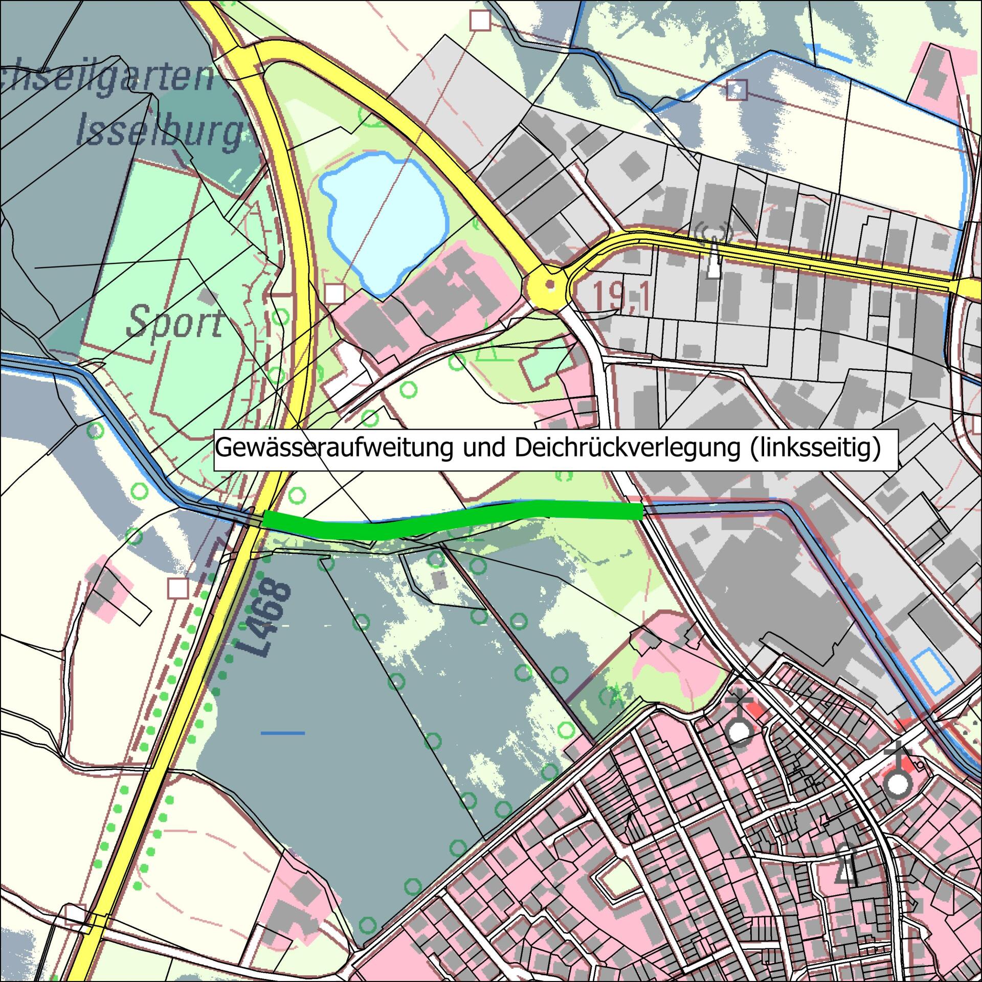 Das linksseitige Vorland soll als Polderfläche genutzt werden und über Überlaufschwellen geflutet und mittels Durchlässe wieder entwässert werden. Rechtsseitig der Issel kann eine Deichrückverlegung um 50 m erfolgen um die Issel dort aufzuweiten und ökologisch aufzuwerten. Ein neuer Deich (rot) schützt die dahinterliegende Bebauung auf dem rechten Vorland.